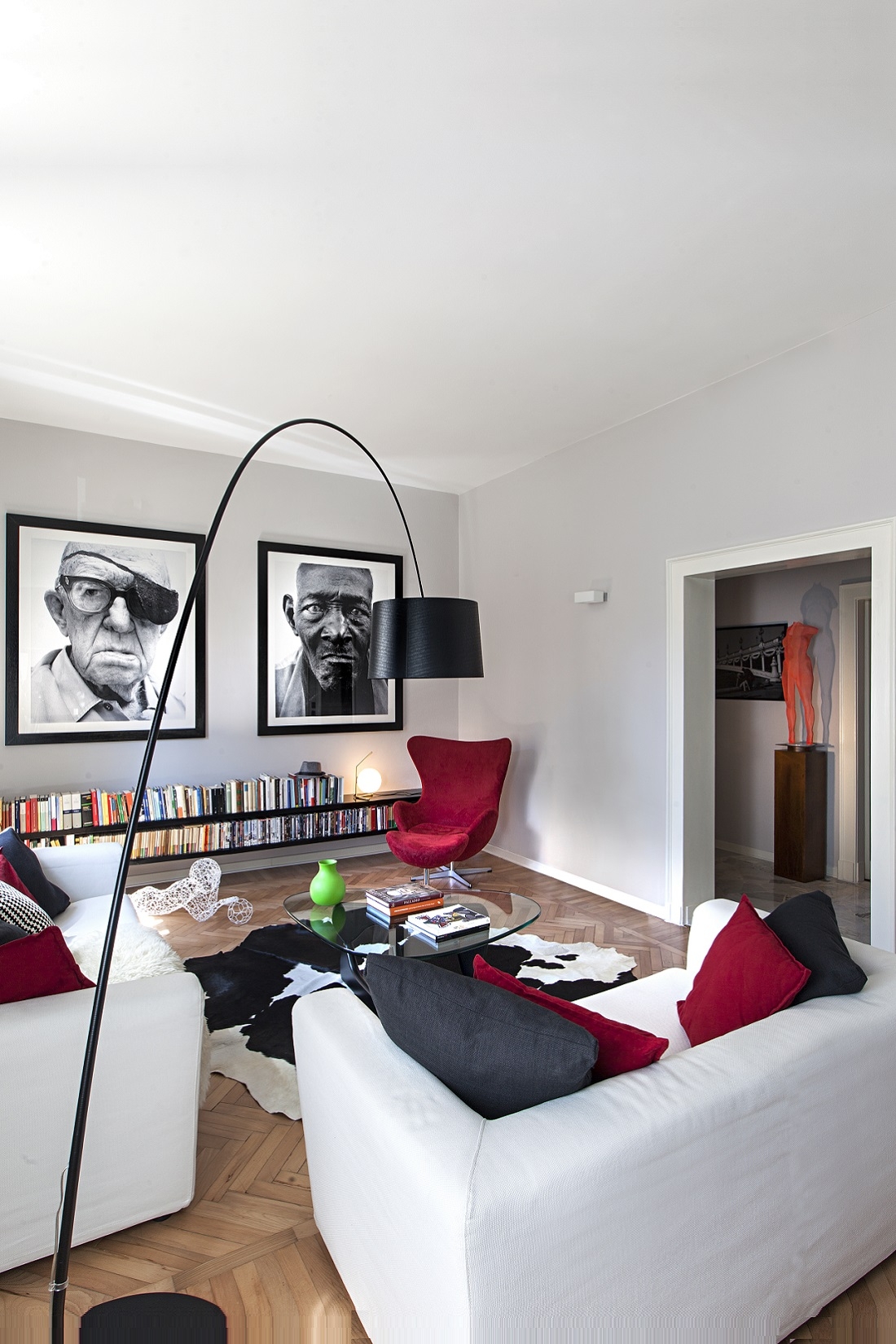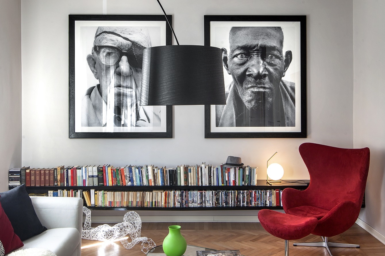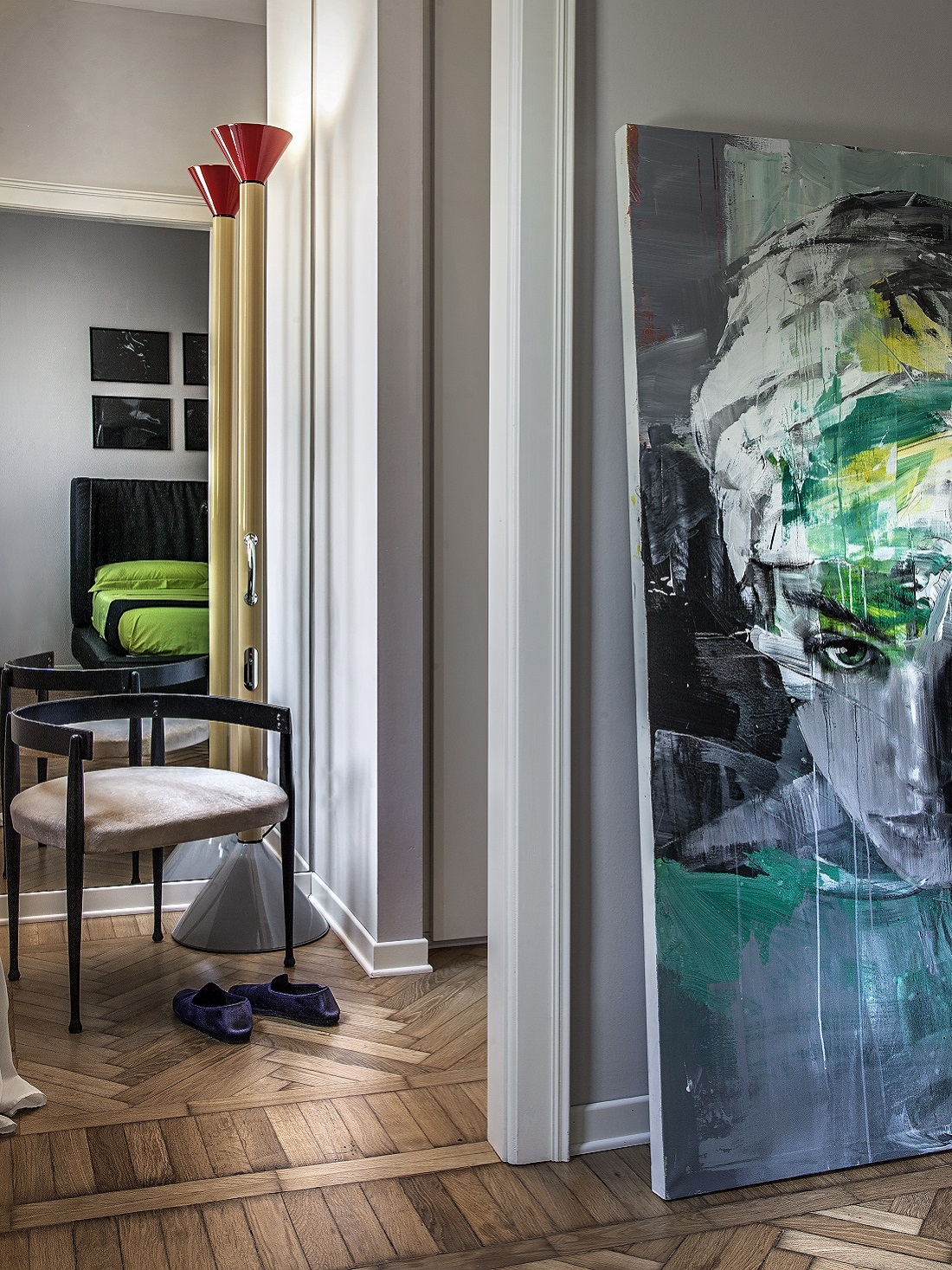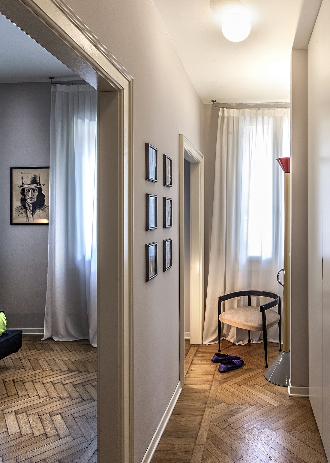 The dove-colored walls, the herringbone floors and the original skilfully restored doors are the backdrop for sculptures, works of art and large photographs of faces by Richard Avedon.