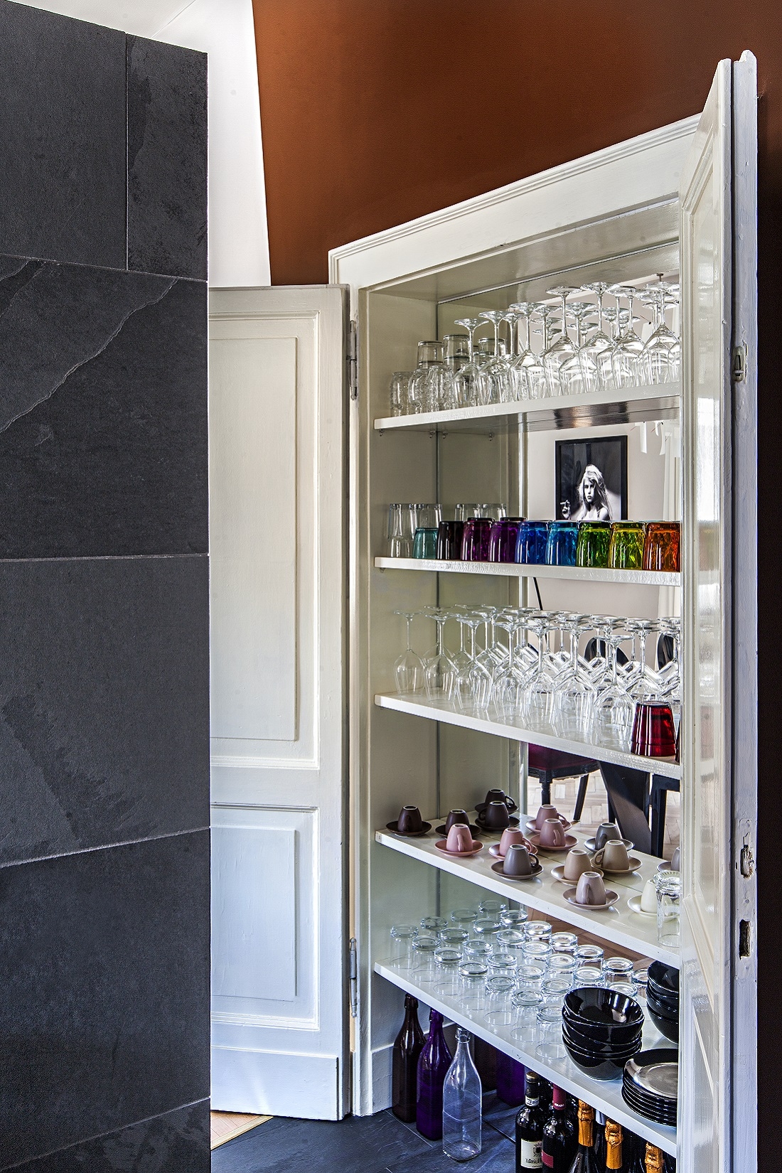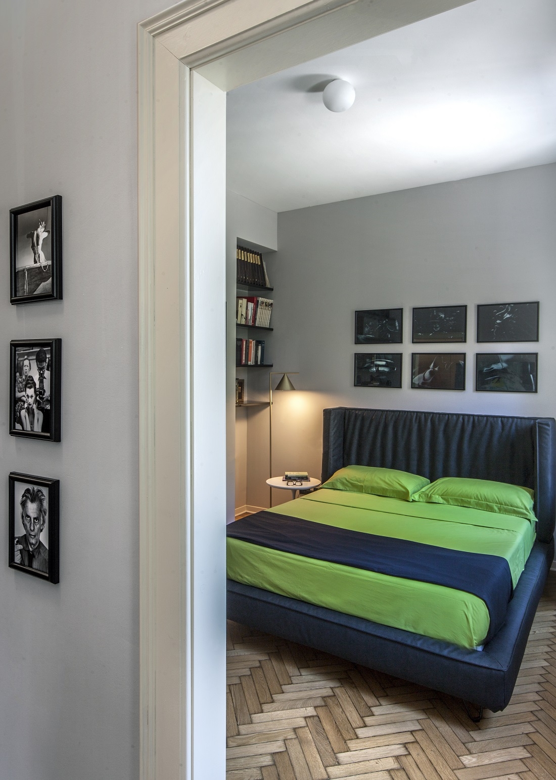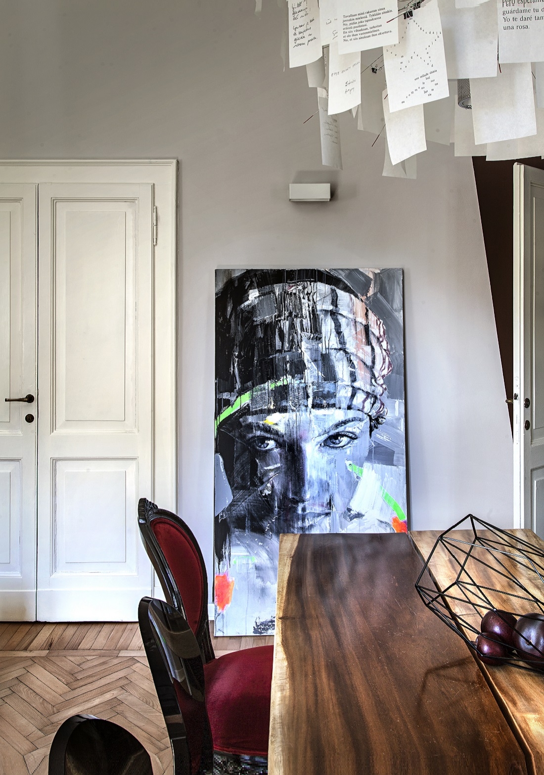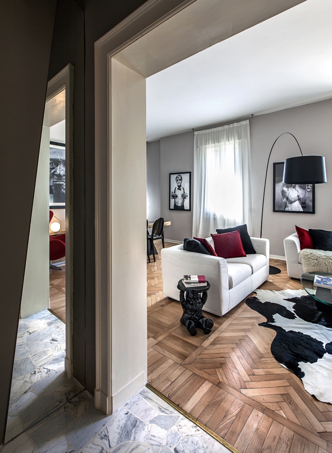 The dove-colored walls, the herringbone floors and the original skilfully restored doors are the backdrop for sculptures, works of art and large photographs of faces by Richard Avedon.
