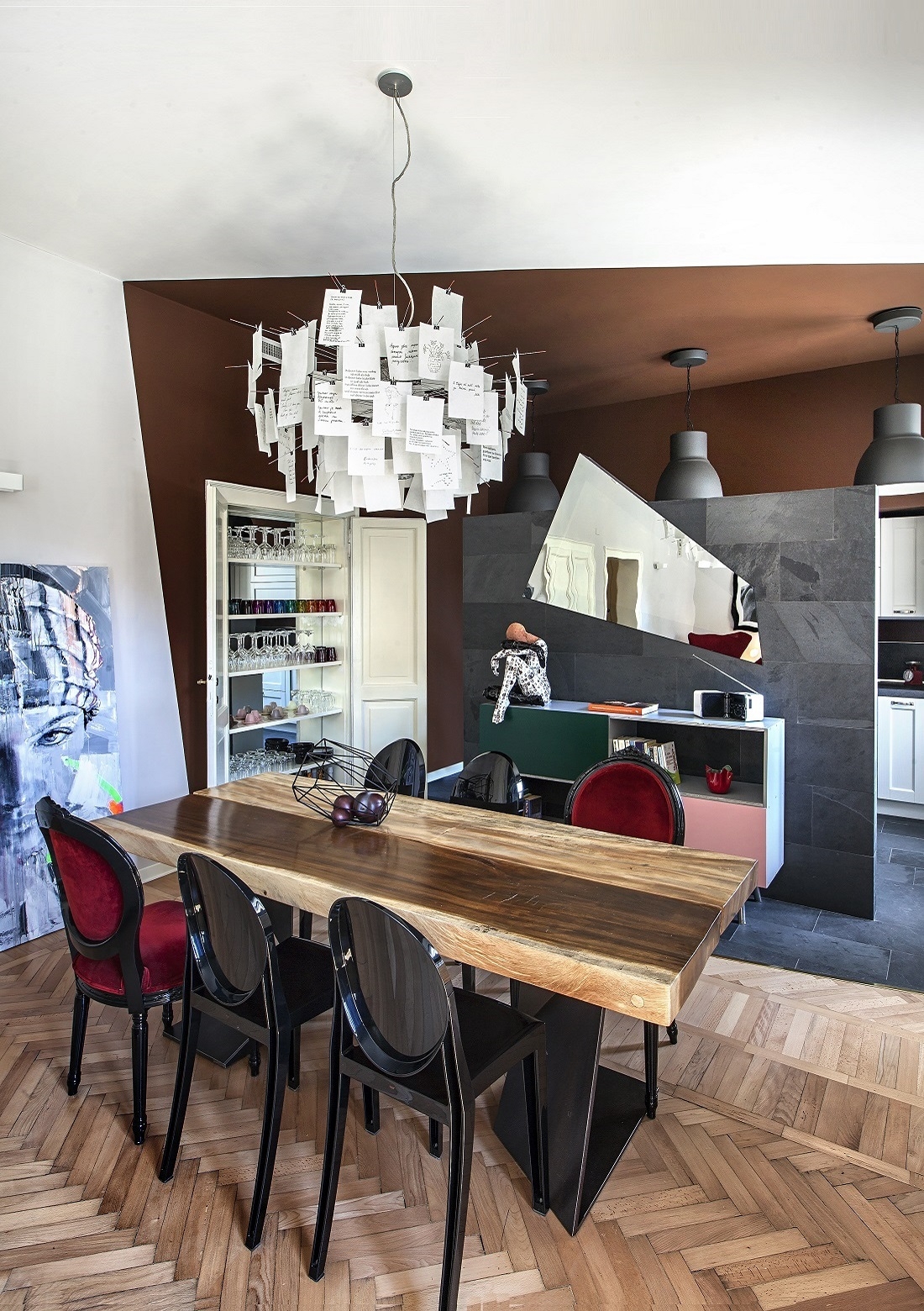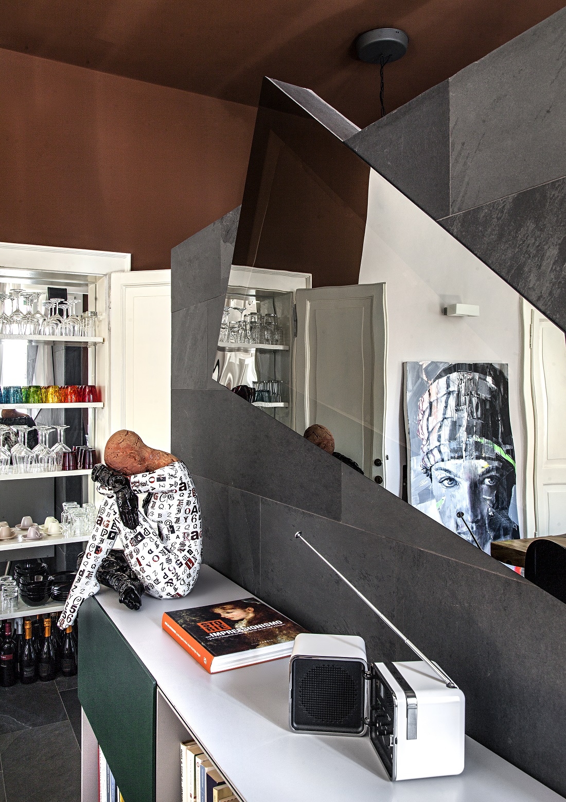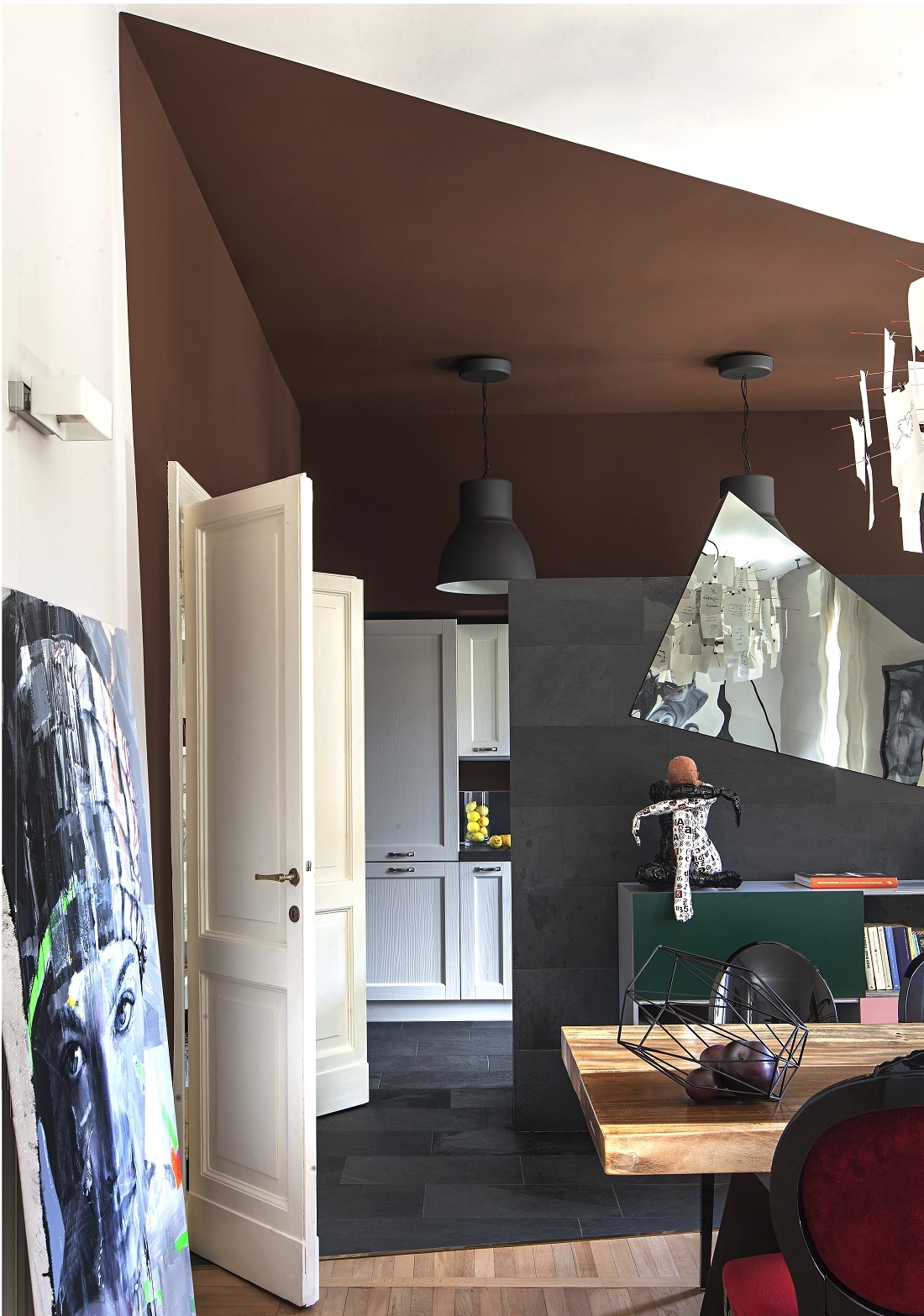 Scenographic choices with Decò touches, a few design pieces and strong chromatic contrasts combine to create evocative and comfortable environments, ideal for feeling at ease in the eclectic spirit of the home.