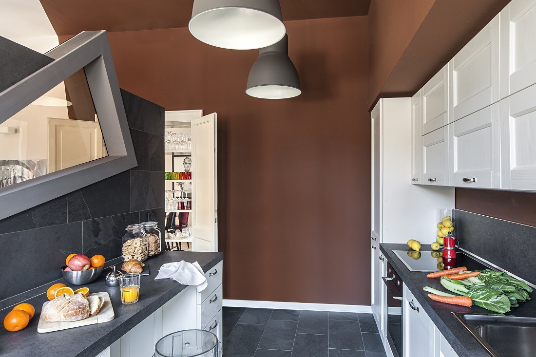 The dark color of the walls and ceiling of the kitchen aim to obtain the effect of a room within another room.