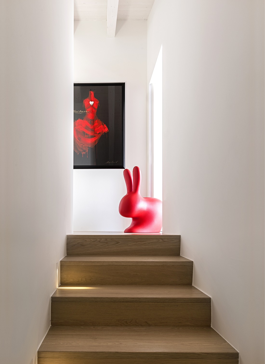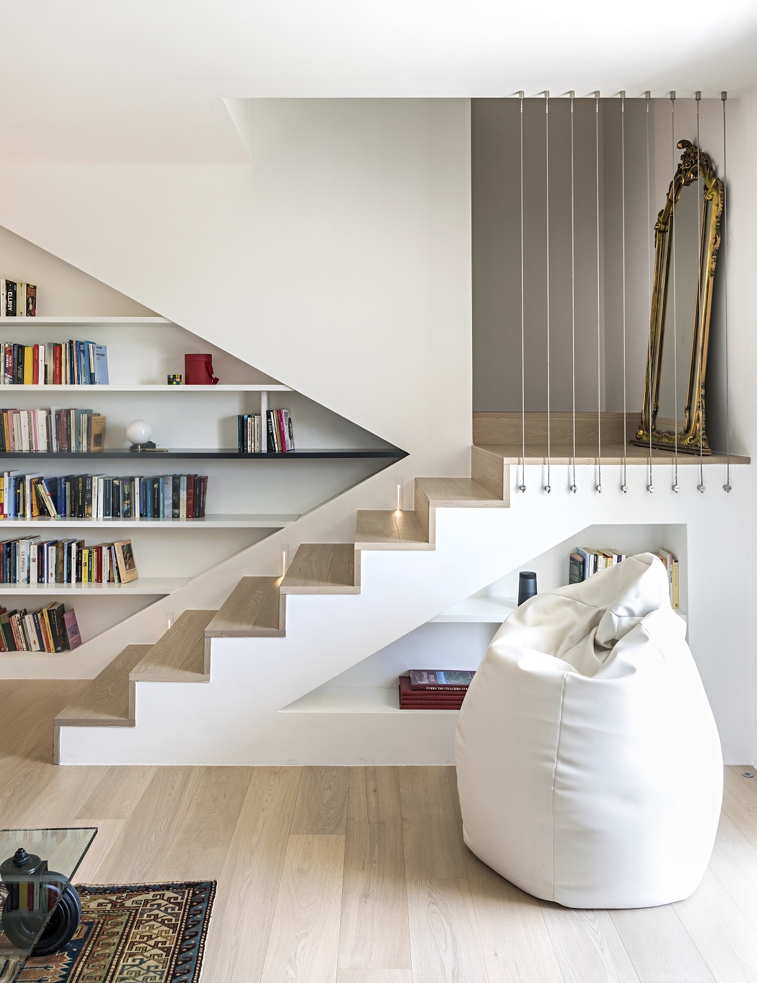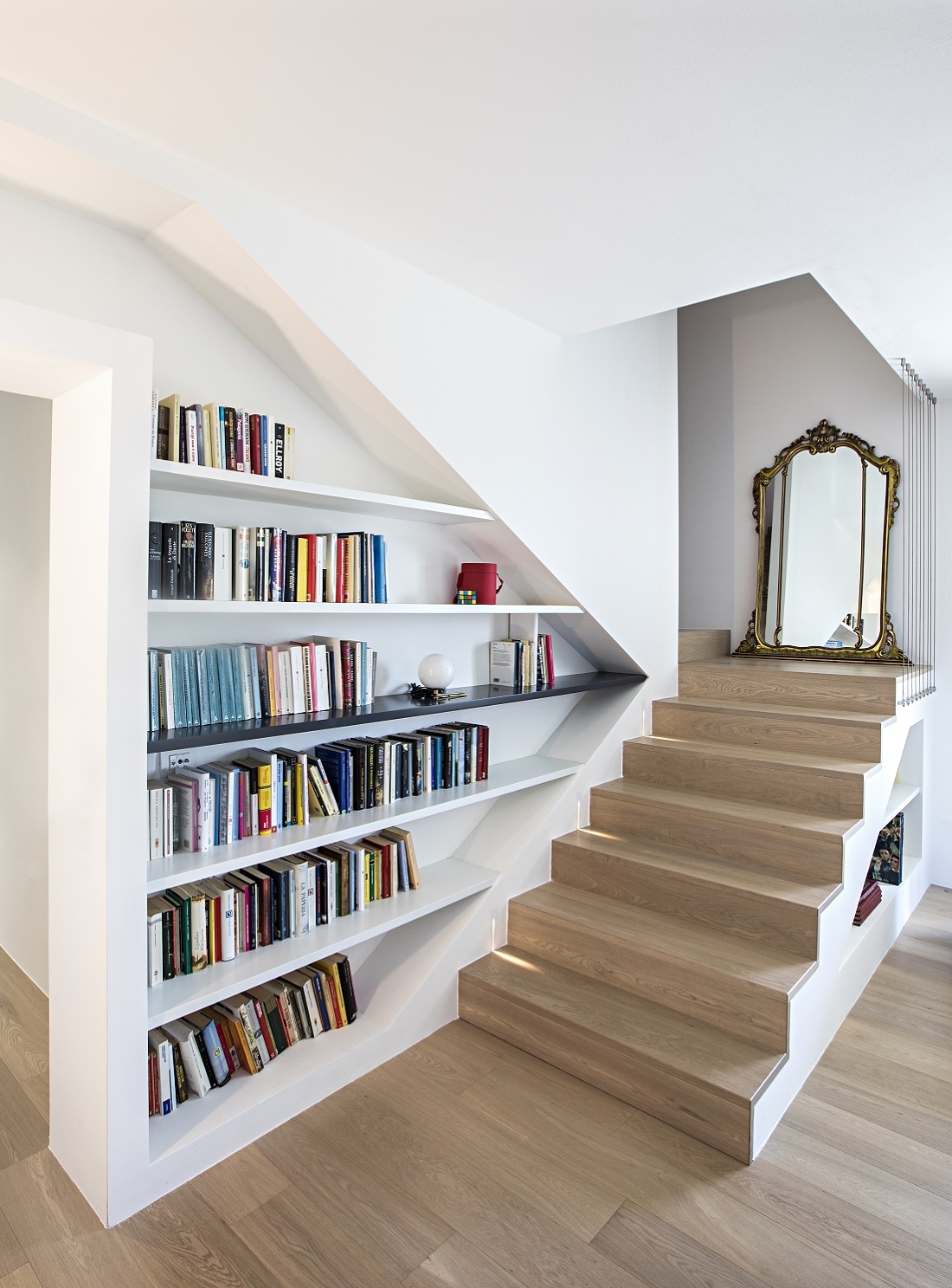 This strong architectural sign is then balanced by a bookcase, along the staircase, into which the shelf insinuates itself.
