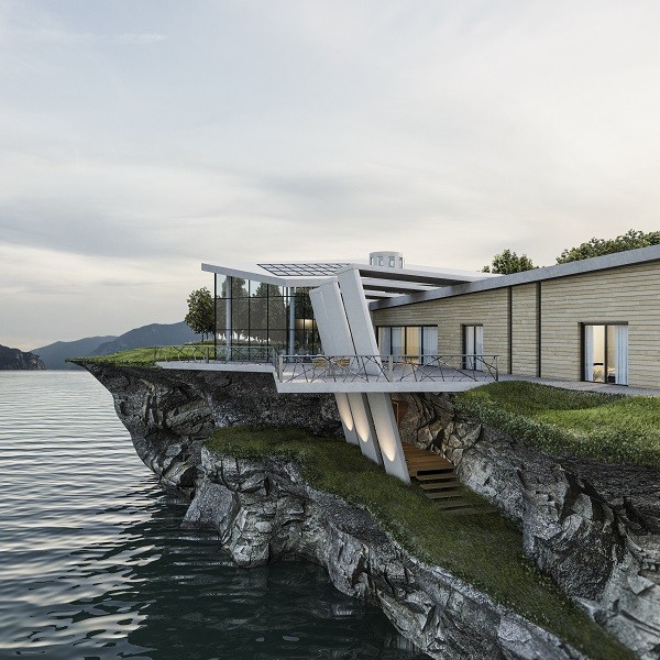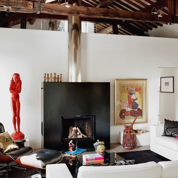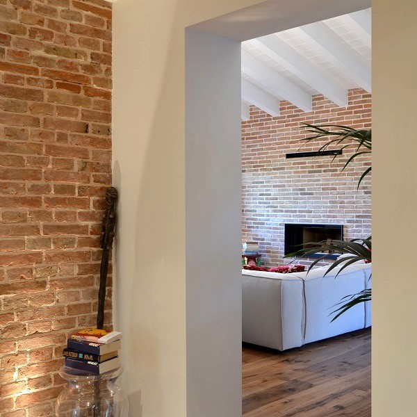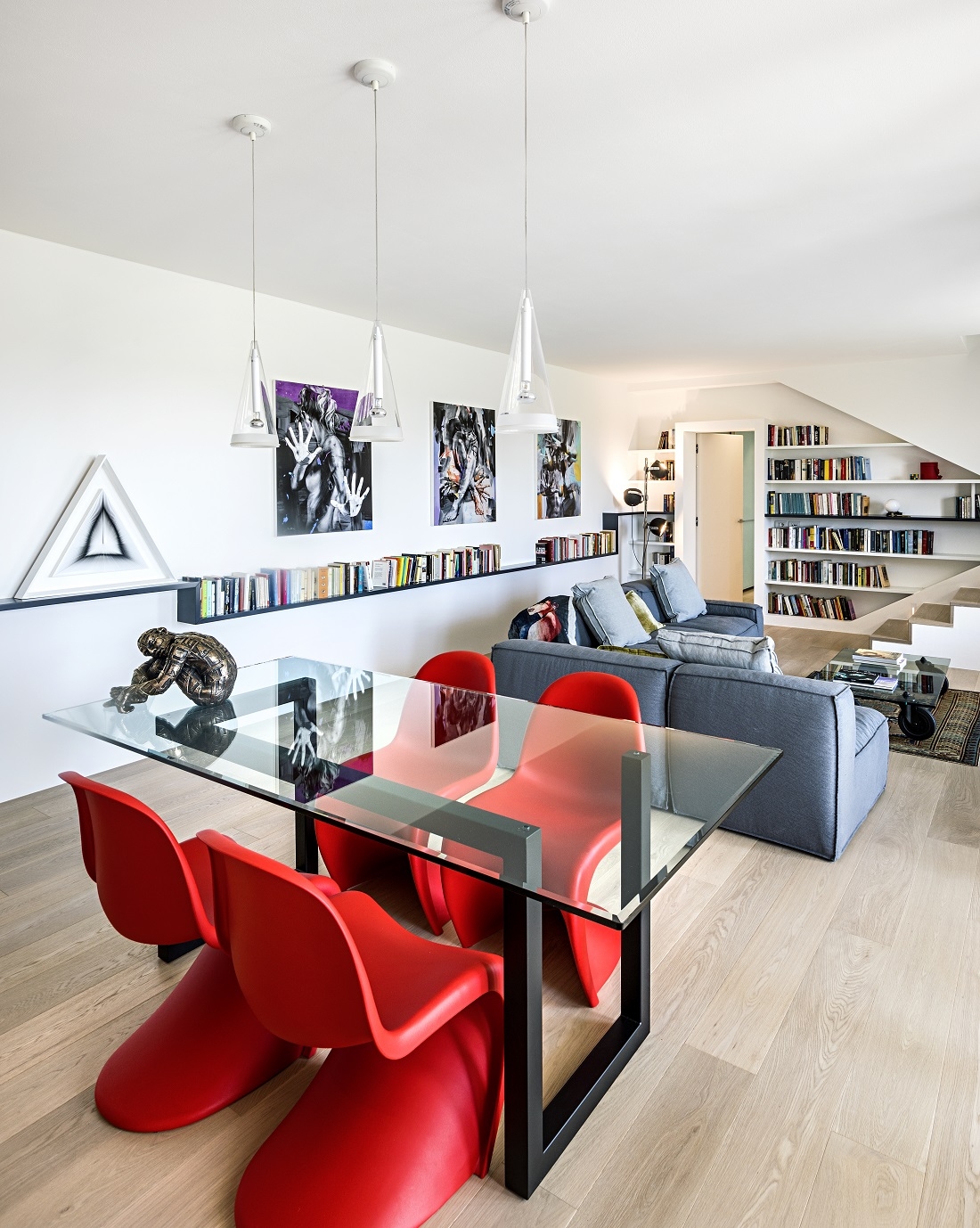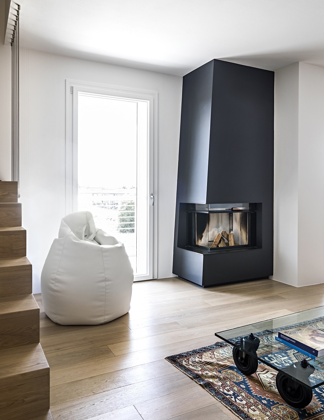 This strong architectural sign is then balanced by a bookcase, along the staircase, into which the shelf insinuates itself.