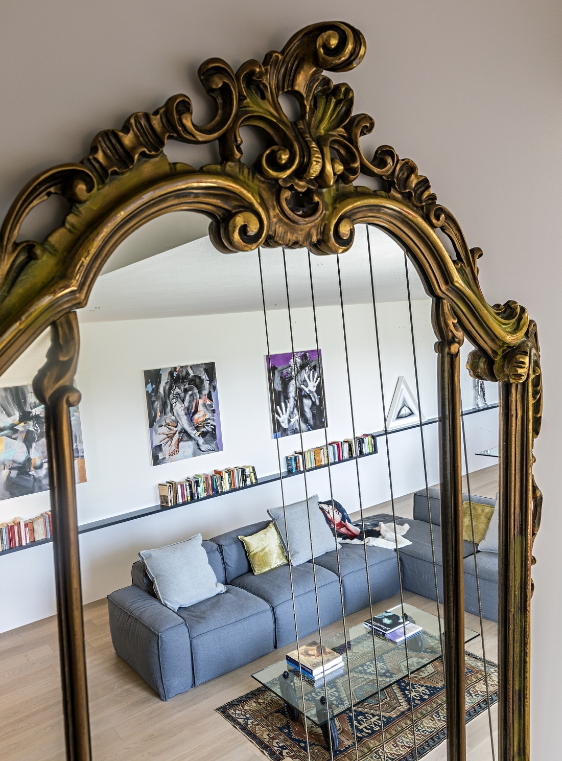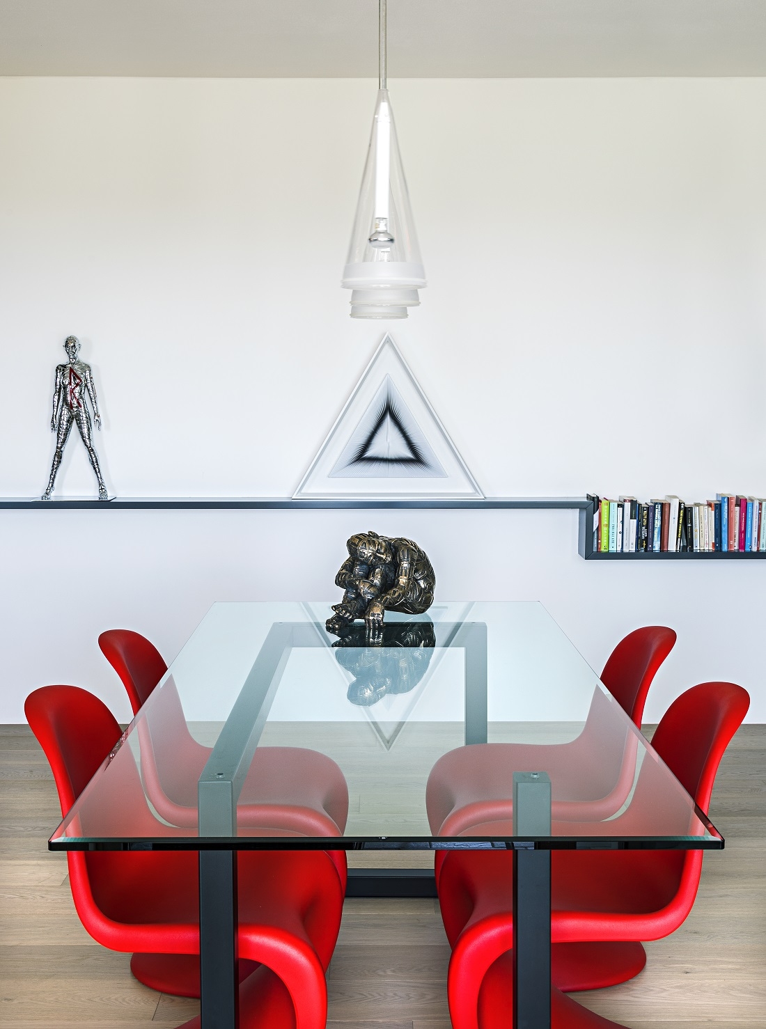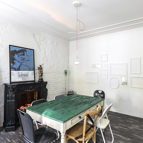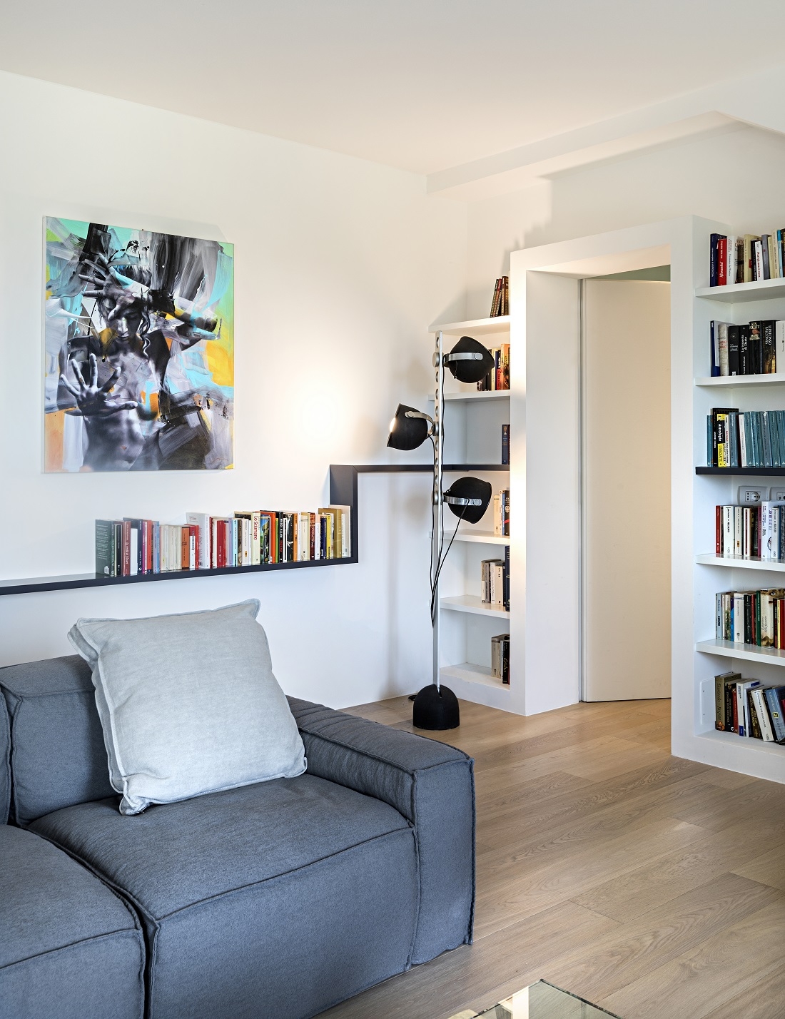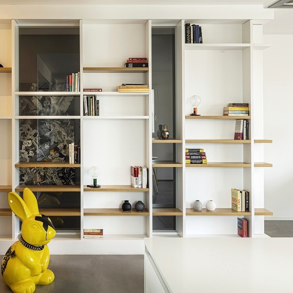 To underline the length of that room, a suspended and uninterrupted shelf-container was created that houses 150 books under which a led light was run that marks the spaces more markedly at night.