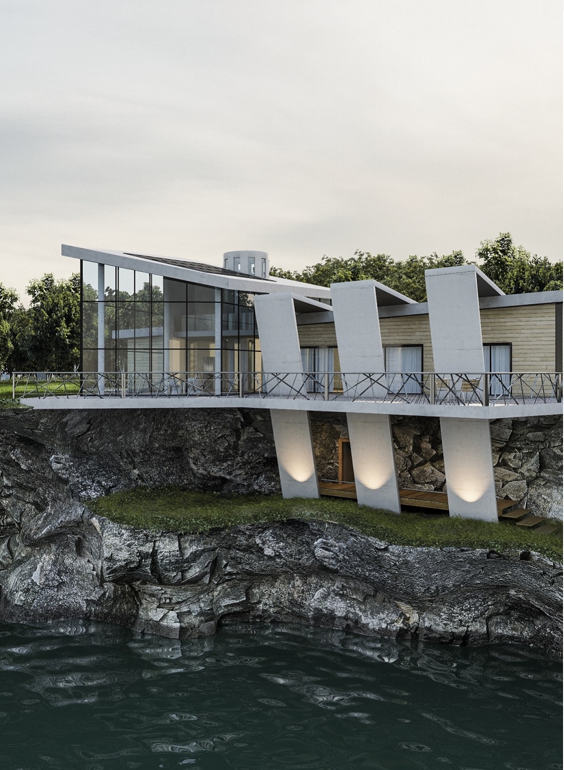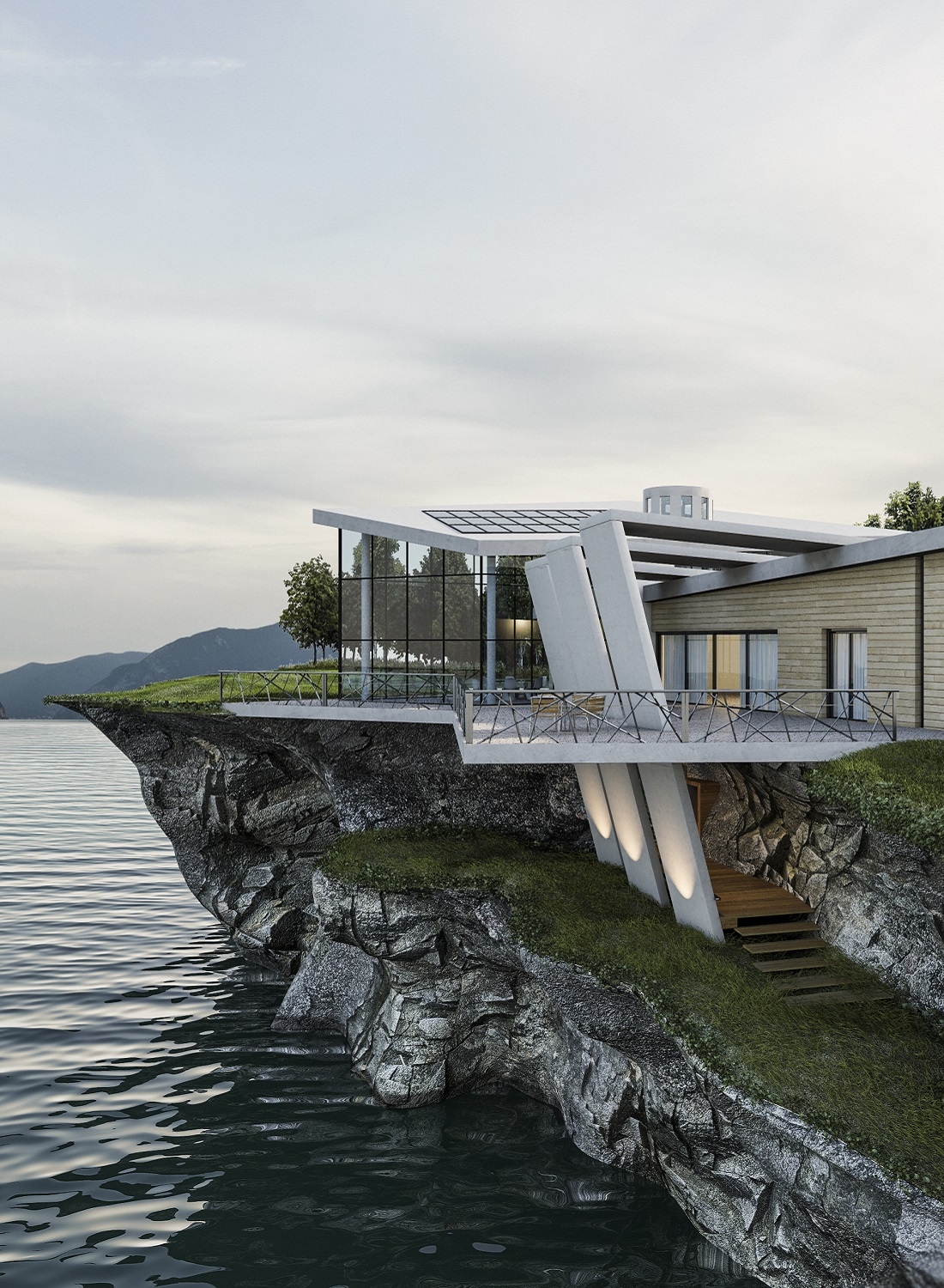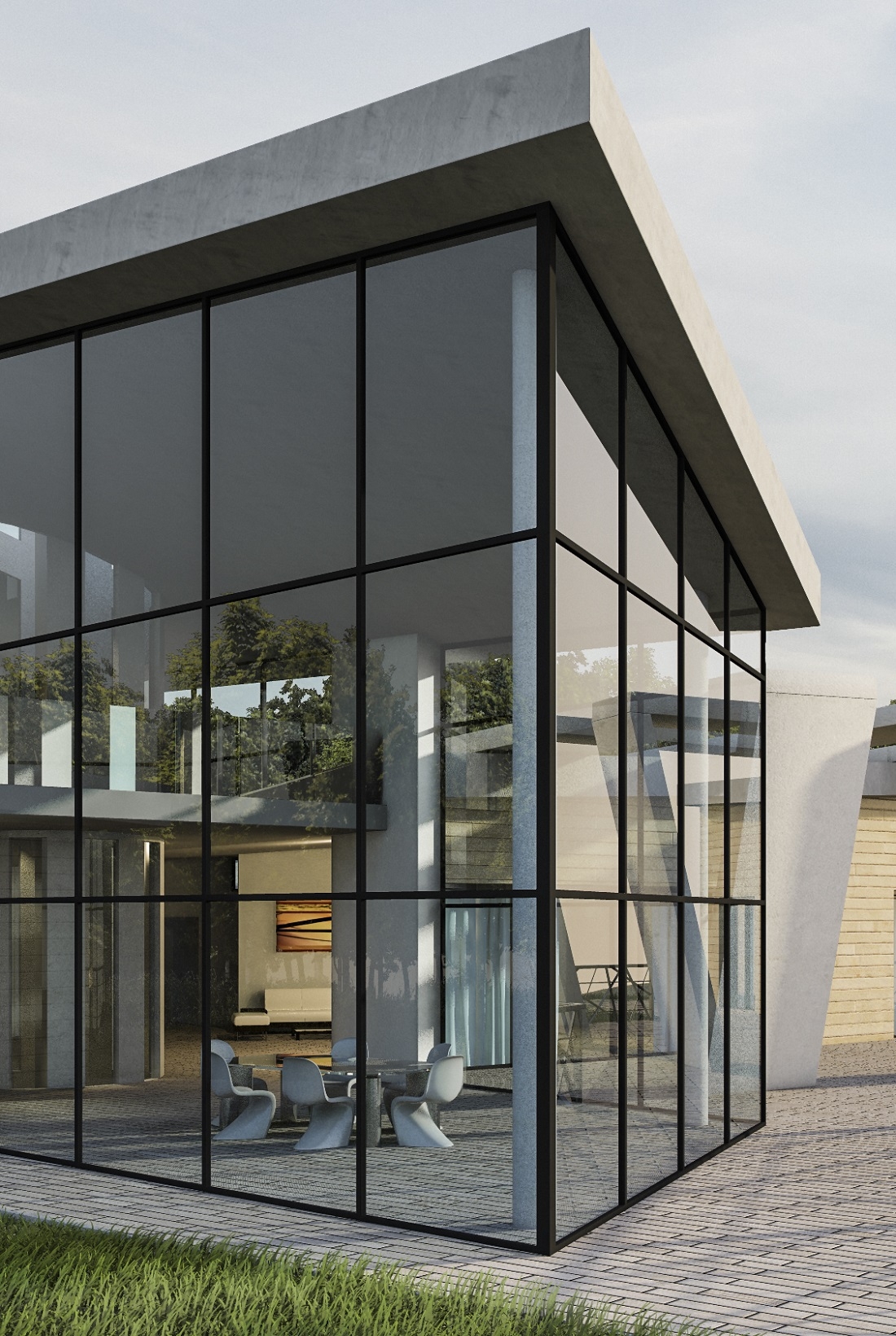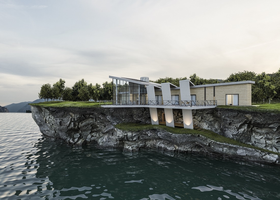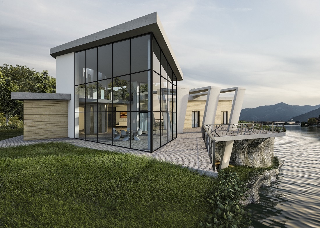 The large double-height windows in the living area allow you to fully enjoy the view of the landscape.