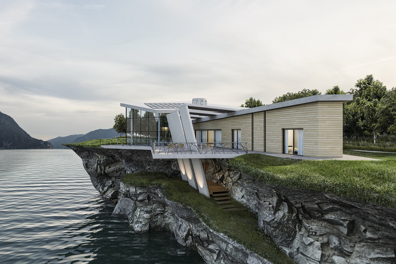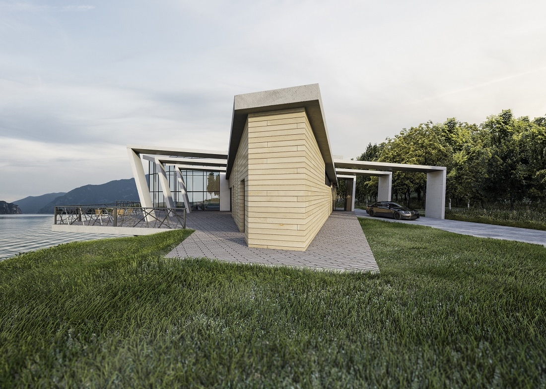 The walls of the building are clad in wooden slats with large exposed concrete elements which act as support for the terrace and then become a sort of "portico" which also extends to the rear of the villa.